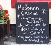 “Husband Crèche. Is he getting under your feet?? Why not leave him here while you shop? Free crèche, just pay for his drinks!“